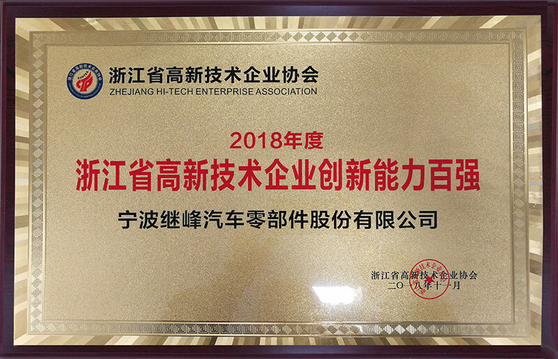 公司荣获“2018年度浙江省高新技术企业创新能力百强”荣誉称号;